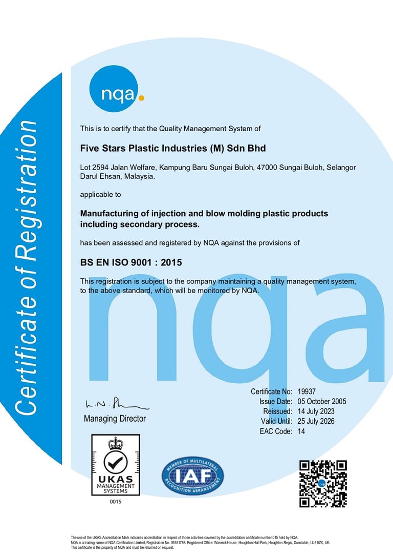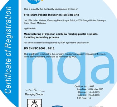 Five Stars Plastic Industries maintains a contemporary, certified Quality Management System (QMS) ensuring reliable manufacturing and consistent product quality. Our QMS is certified to the latest international standard, BS EN ISO 9001:2015, demonstrating our commitment to systematic process control, risk-based thinking, and continuous improvement across all operations.